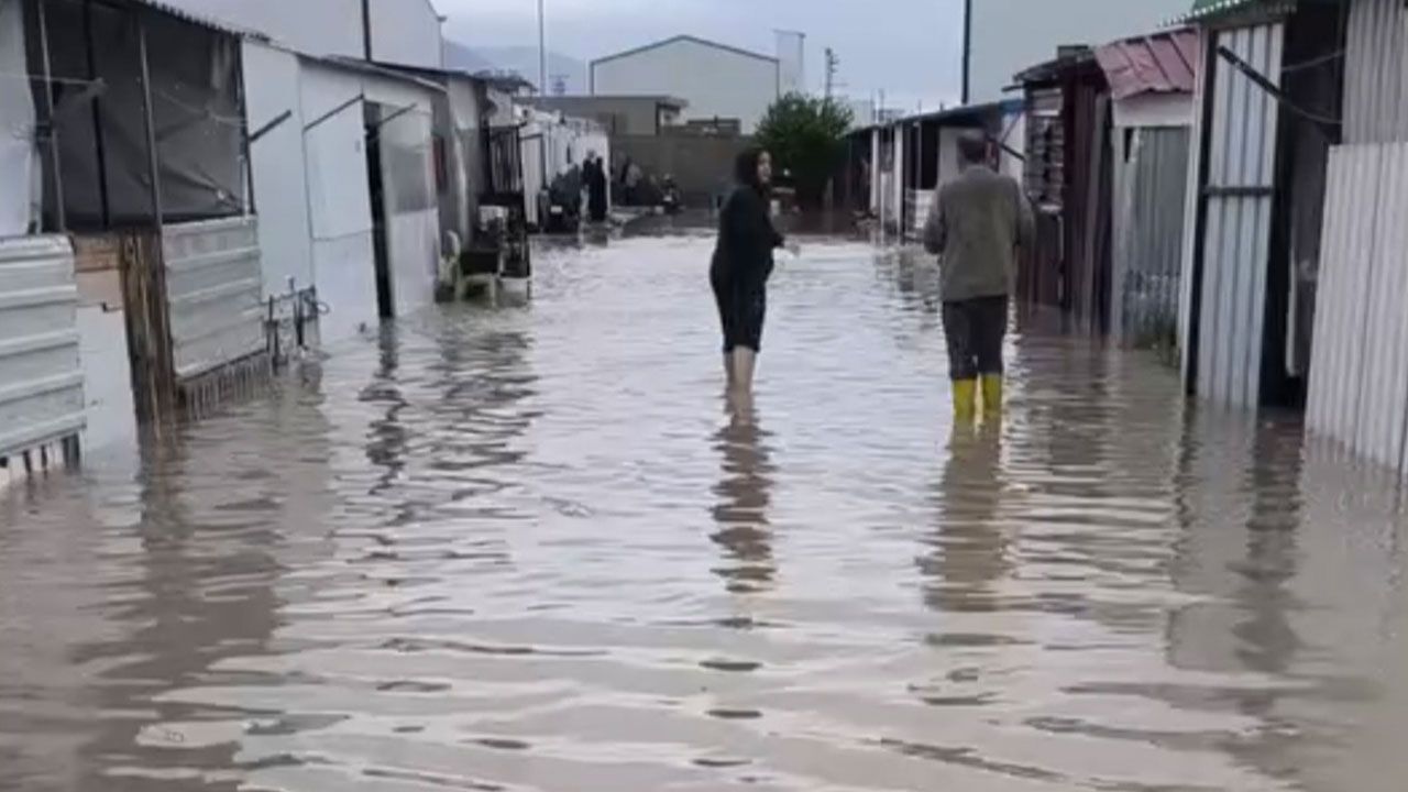 Hatay’da şiddetli yağış etkili oldu, göle dönen yollarda araçlar mahsur kaldı, konteyner kentleri su bastı.